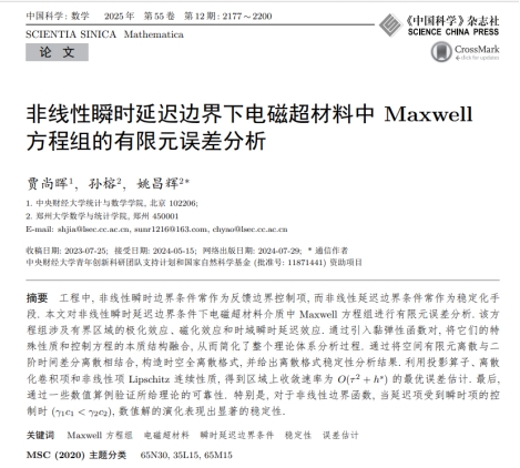 工程中,非线性瞬时边界条件常作为反馈边界控制项,而非线性延迟边界条件常作为稳定化手段。本文对非线性瞬时延迟边界条件下电磁超材料介质中Maxwell方程组进行有限元误差分析。该方程组涉及有界区域的极化效应、磁化效应和时域瞬时延迟效应。通过引入黏弹性函数对,将它们的特殊性质和控制方程的本质结构融合,从而简化了整个理论体系分析过程。通过将空间有限元离散与二阶时间差分离散相结合,构造时空全离散格式,并给出离散格式稳定性分析结果。利用投影算子、离散化卷积项和非线性项Lipschitz连续性质,得到区域上收敛速率为O(τ2+hs)的最优误差估计。最后,通过一些数值算例验证所给理论的可靠性。特别是,对于非线性边界函数,当延迟项受到瞬时项的控制时(γ1c1<γ2c2),数值解的演化表现出显著的稳定性。