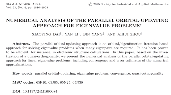 必赢官网杨斌助理教授与中国科学院数学与系统科学研究院周爱辉研究员、戴小英研究员以及博士生李岩合作研究论文Numerical Analysis of the Parallel Orbital-Updating Approach for Eigenvalue Problems发表在数学领域国际顶刊SIAM Journal on Numerical Analysis。并行轨道更新方法是一类基于轨道(特征函数)迭代的特征值问题求解方法,特别适用于需要计算大量特征对的情形。相关算法已经集成到著名的第一原理计算开源软件Quantum ESPRESSO的公开发布版中,并已展示出其在大规模体系电子结构计算方面较已有方法的优势,具有显著的计算效率以及并行可扩展性。然而,迄今为止,尚缺乏对并行轨道更新方法的严格数学理论支撑。论文引入轨道的拟正交性,建立了一个清晰的数值分析理论框架,基于该框架对并行轨道更新方法在线性特征值问题中的数值理论进行了系统研究,给出了数值逼近解的收敛性以及误差估计。